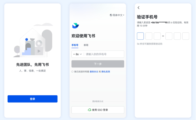 1、首次打開(kāi)飛書(shū)客戶端,點(diǎn)擊登錄,輸入手機(jī)號(hào),點(diǎn)擊下一步。輸入驗(yàn)證碼完成驗(yàn)證。注:如果你不是首次打開(kāi)飛書(shū)客戶端,你可以直接輸入手機(jī)號(hào)開(kāi)始注冊(cè)。